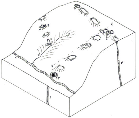 | 16:23, 24. Jun. 2012 | Abb 066.jpg (Datei) | 68 KB | Markscheider | Abbildung 66: Aufsuchen der Zugänge im Gelände 1) größeres Gewässer; 2) Bach, Taleinschnitt; 3) Stollenpinge mit Halde und Wasseraustritt; 4-4') Haldenzug auf Erzgang; 5) Stollenmundloch; 6) Häufung größerer und kleinerer Halden auf einem Gangk… | 1 | |