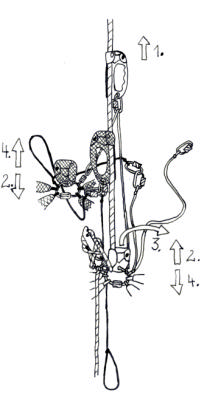 | − | + | Nun steigt der Helfer in seine Fußschlinge, hängt seine Bruststeigklemme aus und schiebt die Handsteigklemme des Verletzten so weit wie möglich nach oben (Abbildung 180 Bild 4), Schritt 1). Anschließend setzt er sich wieder – sein Körpergewicht bildet nun das Gegengewicht zum Körpergewicht des Verletzten. Es ist nur noch die Reibung und eine eventuelle Gewichtsdifferenz zu überwinden, damit der Helfer den Verletzten so weit als möglich nach oben schieben kann (Abbildung 180 Bild 4) Schritt 2). Dadurch wird die Bruststeigklemme des Verletzen entlastet und kann vom Seil gelöst werden (Abbildung 180 Bild 4) Schritt 3.). Frei gewordenes Seil wird durch den Abseiler gezogen und dieser wieder festgelegt (Abbildung 180 Bild 4) Schritt 4). Dann tritt man wieder in die Fußschlinge und setzt den Verletzten in den Abseiler. Jetzt ist die Hauptsache geschafft. | |