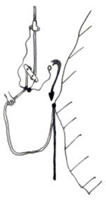 11 KB | Abbildung 168: Umsteigestelle im frei hängenden Seil mit Sicherungsschlinge Statt des Achterknotens zur Seilverbindung kann, wer kann, den doppelten Spierenstich verwenden (Abbildung 139). | 1 |