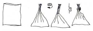 Stoßunempfindliche, sperrige Sachen, zum Beispiel trockene Wechselklamotten oder das Frühstück, kann man in Plastiktüten wasserdicht einknoten (Abbildung ALDI-Ortlieb). Zwei Lagen übereinander halten auch in extremen Situationen dicht. Zur Not läßt sich auf diese Weise auch mal der Koffer mit der Akkubohrmaschine durchs Wasser befördern. Auch Ortlieb-Säcke (siehe Rucksack, wieder Globetrotter Ausrüstung) eignen sich, sind aber ganz schön teuer.