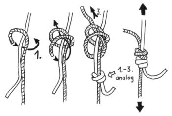 Abbildung 139: Legen eines doppelten Spierenstichs Der doppelte Spierenstich wird gewählt, um überhaut eine Chance zu haben, denselben wieder zu öffnen. Beim einfachen Spierenstich wird das Seils nur einmal umschlungen.