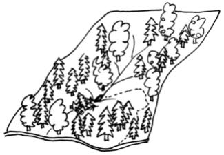 Abbildung 119: Weg zu einem getarnten Zugang Der Weg (dünn gestrichelt) zu einem inoffiziellen Zugang läuft nicht direkt, sondern hinten herum, möglicht jedesmal ein wenig anders gegangen, um keine Trampelpfade zu schaffen