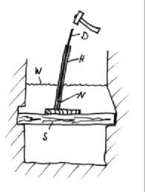 Abbildung 125: Nachnageln von Tragwerk mit einem Nagelstock S) Spreize, noch gut erhalten; W) Wasserstand; H) Hüllrohr; N) Nagel; D) Dorn. Anwendung: Hüllrohr aufsetzen, Nagel in Hüllrohr fallen lassen (Für den Lehrling: Kopf nach oben), Dorn aufsetzen