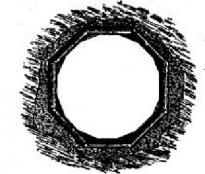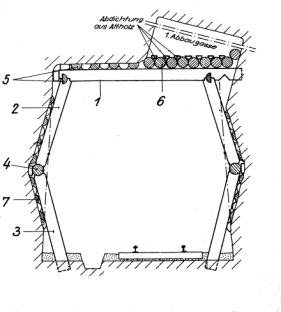 Offener Polygonausbau 1) Kappe; 2) Kopfstempel; 3) Fußstempel; 4) Läufer; 5) Bolzen aus Halbholz; 6) Abrollung (Verzug aus Rundhölzern) bei größeren offenen Hohlräumen, beispielsweise Abbauen; 7) Verzug